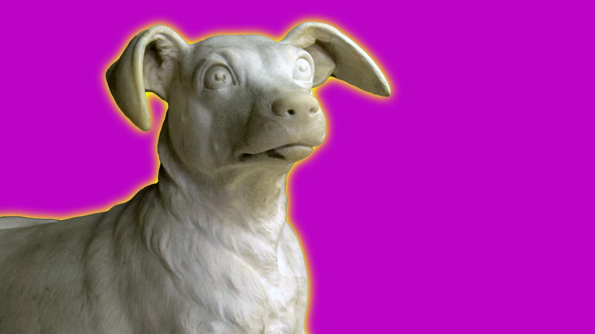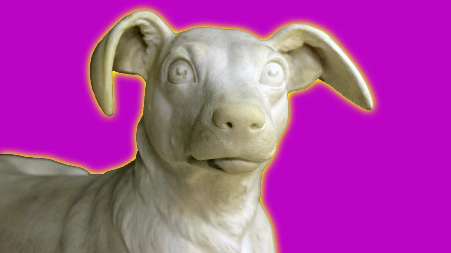 Welcome everyone, to Sculpture Showdown! Today we have two very special guests. First up, howling from 19th-century Italy, it’s the marble magnificence, the whippet wonder – give it up for Marble Doggo!