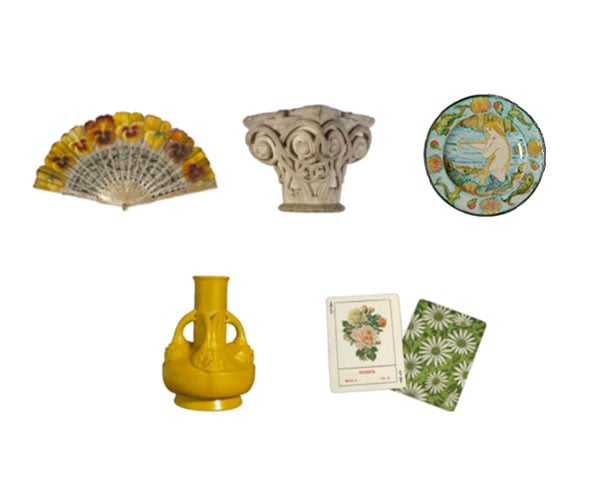 Made in East London, the earrings are inspired by objects from the V&A collection, from a curious yellow vase to a decorative floral card game, each reinterpreted as a playful charm strung on a gold-plated silver chain. The objects were chosen to conjure the idea of a dreamlike underwater world, with curved organic forms that echo the movement of water.