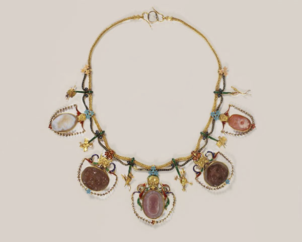 In 1867, English designer Charlotte Newman created this elegant necklace of layered agate cameos. At the time, she was designing for jeweller John Brogden, crafting pieces that blended art and craftsmanship. This necklace, purchased at the Paris International Exhibition that same year, hints at the talent that would soon lead Newman to open her own shop and workshop.
