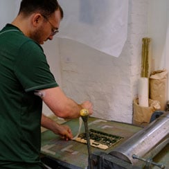 The image has been hand-carved into a woodblock, which is then inked with a roller and printed onto fine Japanese gampi paper.